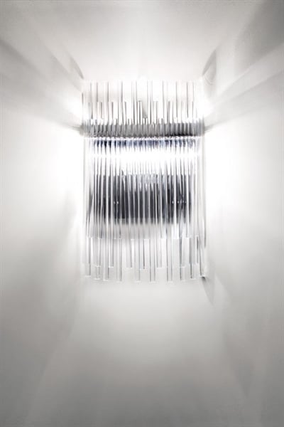 Romani Saccani Architetti Associati tasarımı El yapımı şeffaf camlar ile tasarlanmış aydınlatma sistemi Farklı boyutlarda çubuklar kullanarak hareket hissi sunarken ışığı iyi bir şekilde iletir. Gizli metal gövdeli