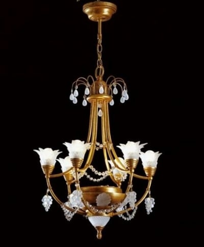 Demir,bronz,kristal,cam Altın rengi Şeffaf kristaller ve beyaz kumlama üzüm şekilli murano cam Çap: 54 cm Yükseklik: 70 cm